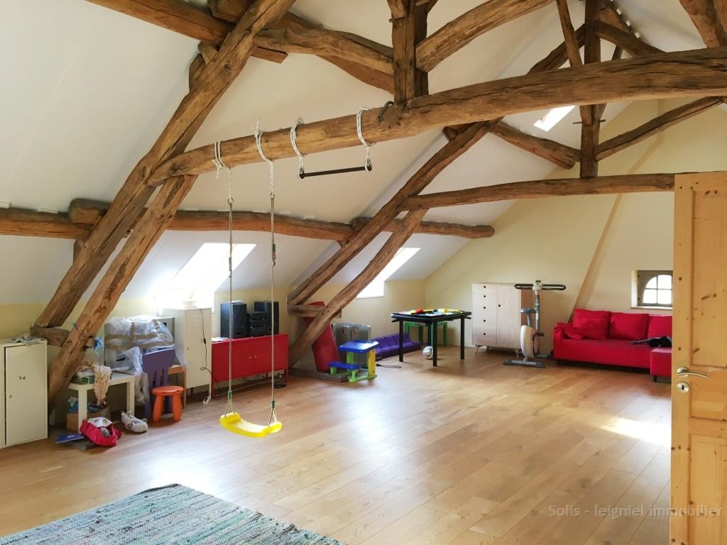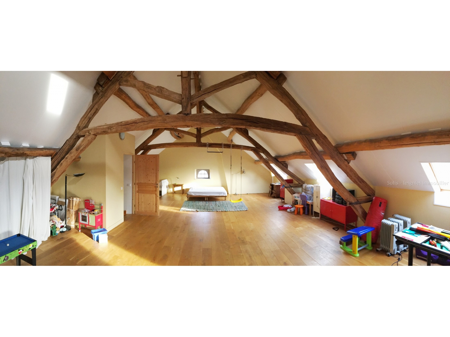 Le dernier étage est réservé aux enfants: lumineuse salle de jeux de 72 m² avec belles poutres apparentes et parquet chêne à larges lames chanfreinées.