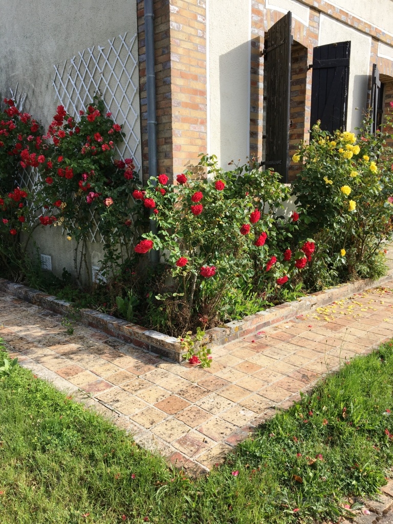 Tour de maison pavée de petits chemins en brique, belle cave voûtée et bûcher.