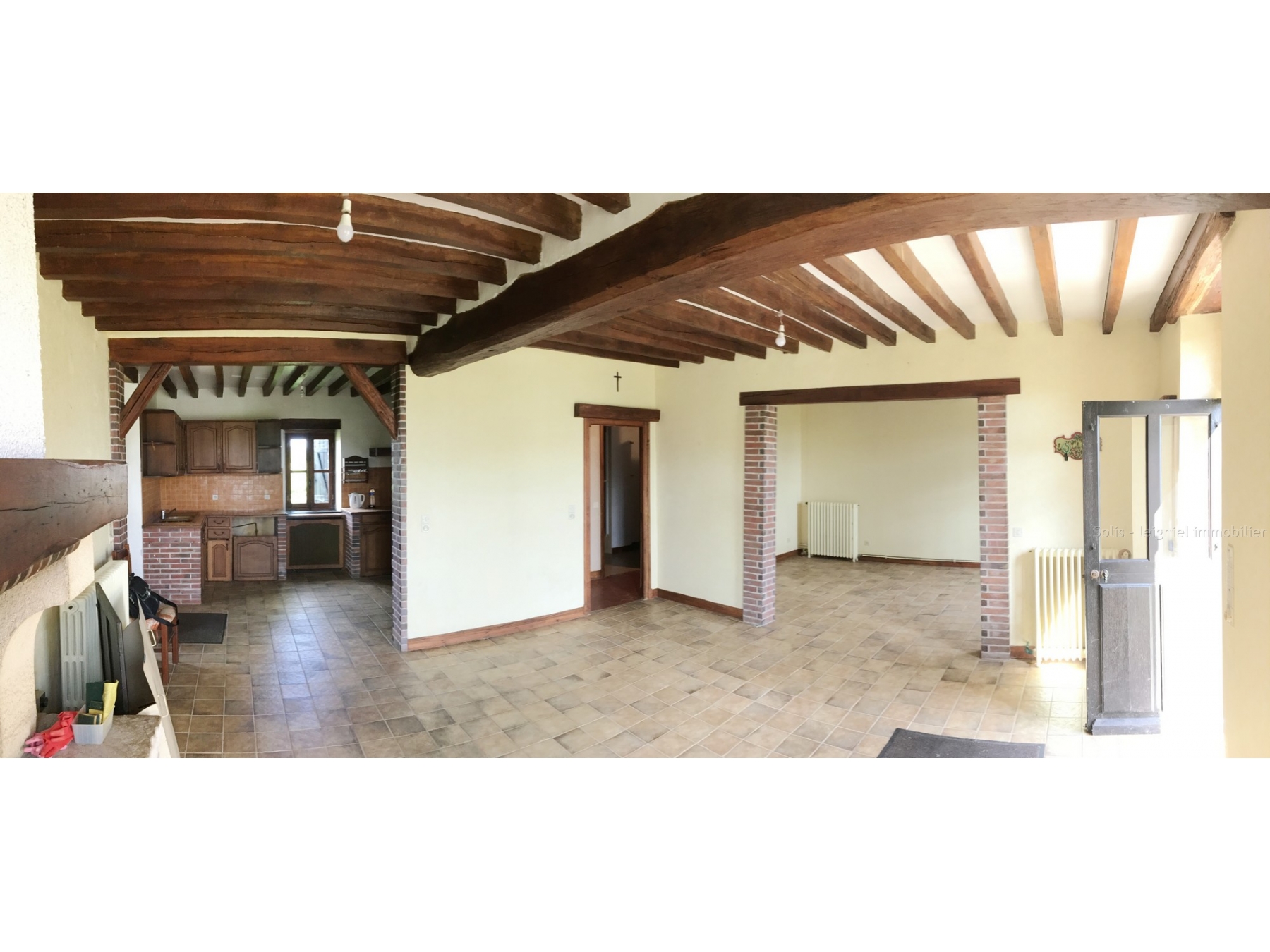 Exposée au sud-est, cette FERMETTE GATINAISE dispose rez-de-chaussée d'une entrée sur une grande pièce de vie de 56 mètres carrés avec poutres et cheminée (comprenant cuisine, salle à manger et petit salon) , puis un couloir dessert une salle d'eau, un WC, et à la suite un VASTE SALON de 58 mètres carrés avec double accès sur le jardin.